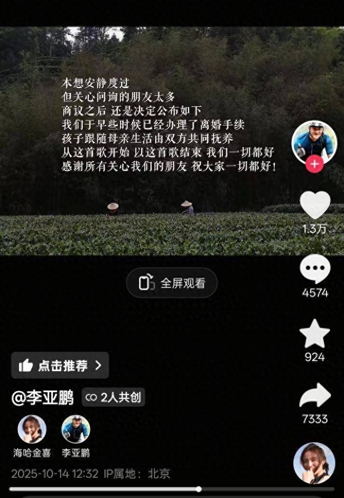 10月14日,54岁的李亚鹏官宣再次离婚。据悉,李亚鹏和二婚老婆海哈金喜在多个社交账号发布视频称,双方已于早前办理了离婚手续,孩子跟随母亲生活,由双方抚养。